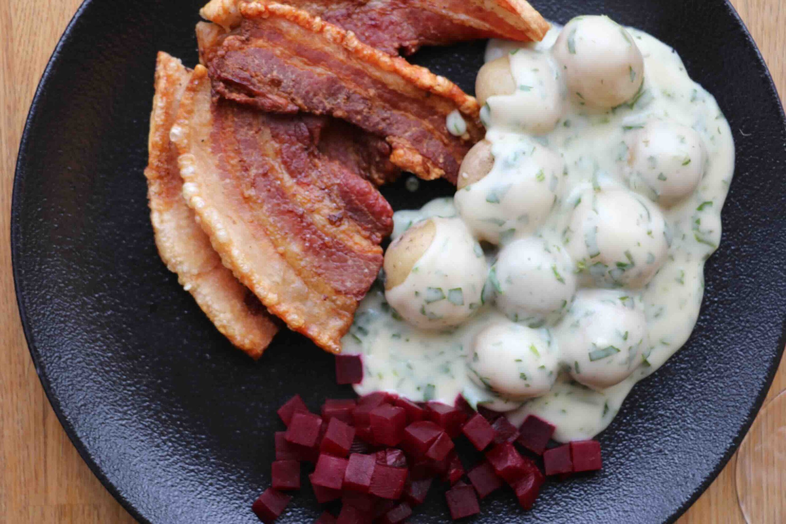 – sprødstegt flæsk med kartofler, persillesovs og rødbeder